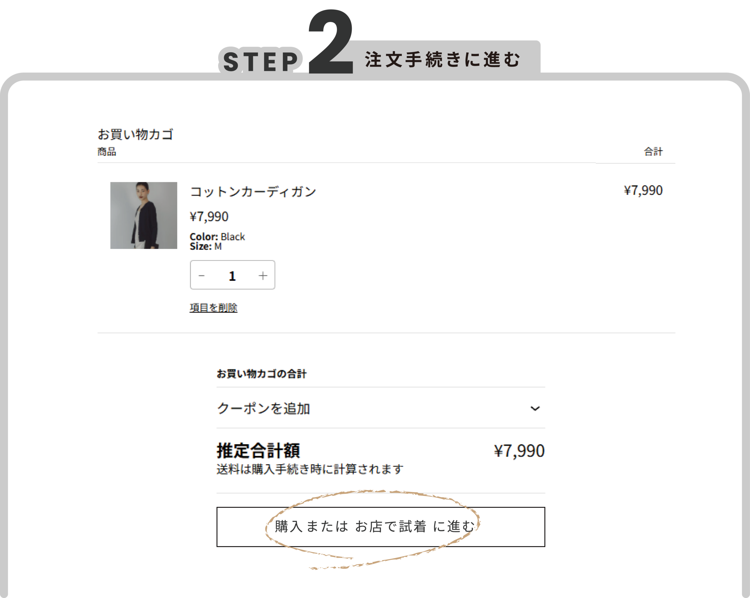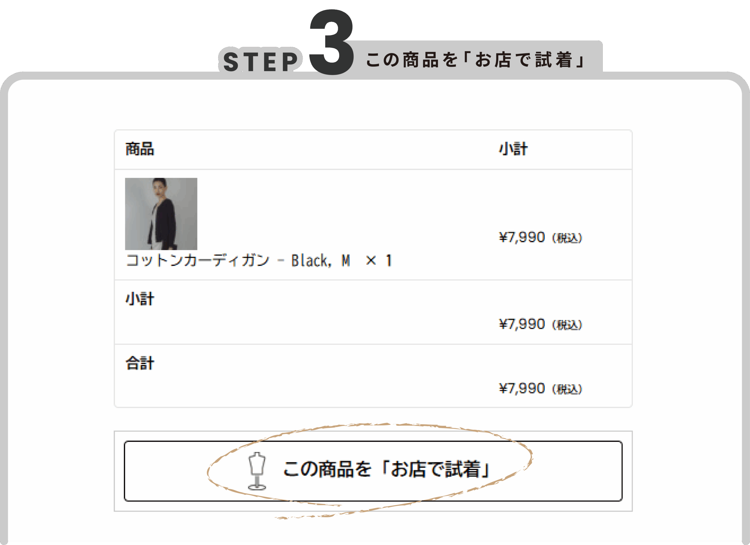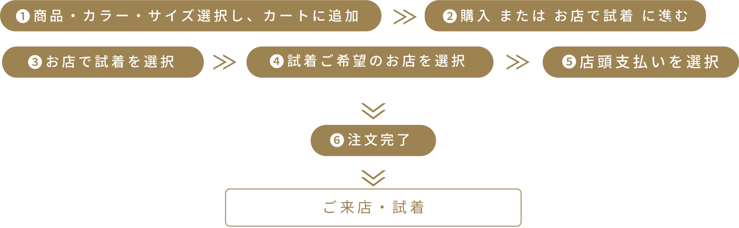 ※ お店で試着をご希望の場合、お支払い方法は店頭支払いのみとなります。