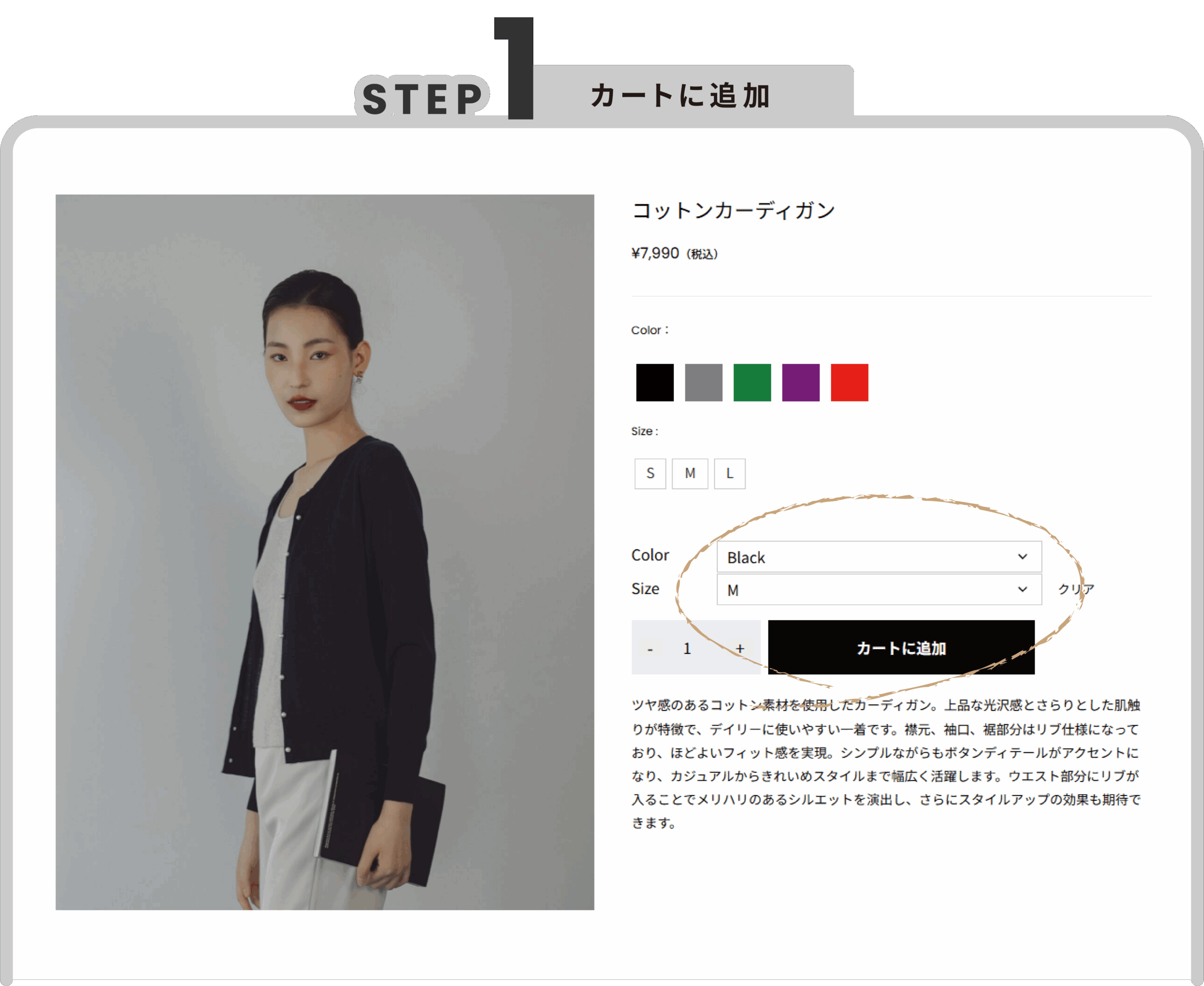 「カラー」・「サイズ」を選択し、カートに追加する。