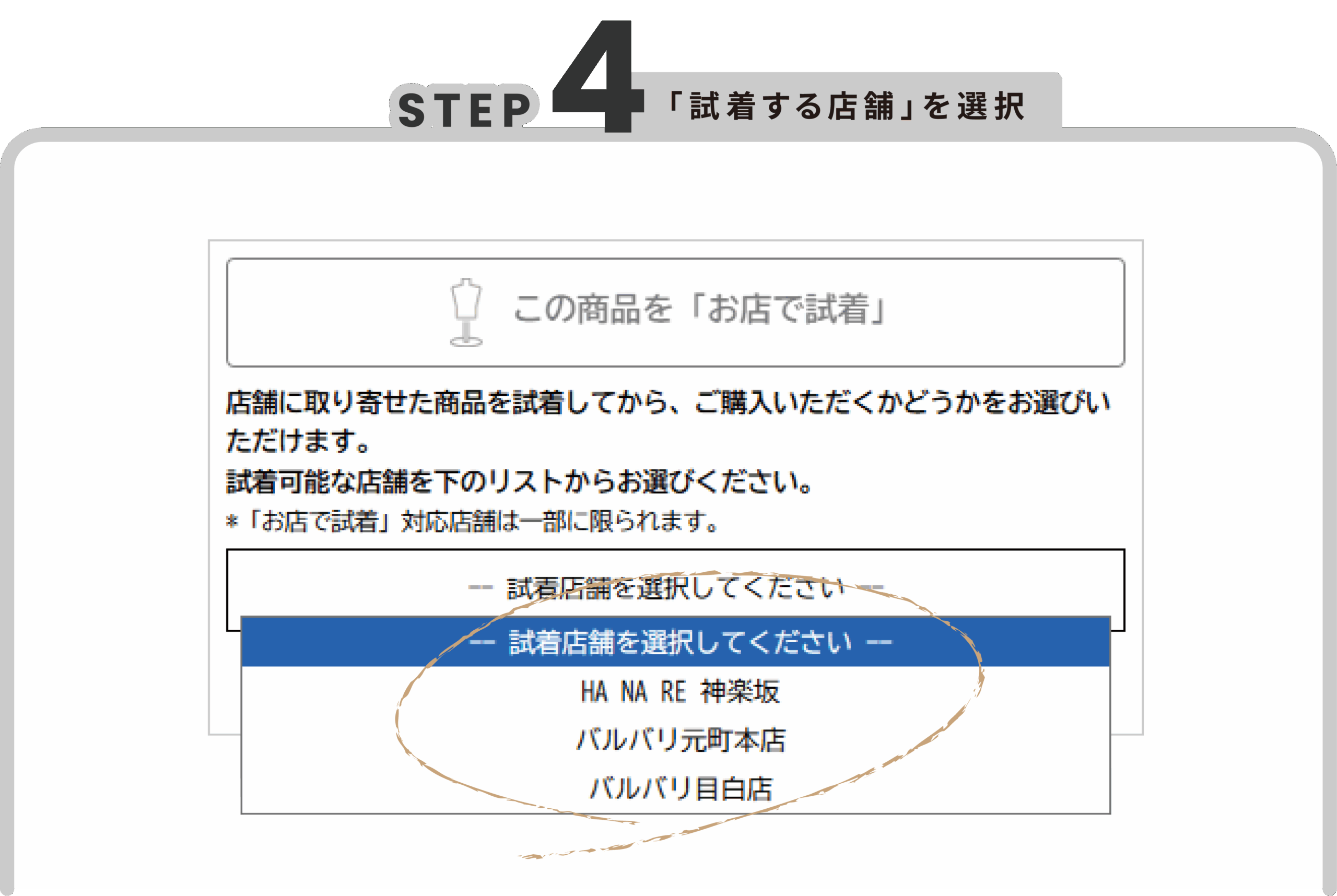 「お店で試着」サービスは、現在以下の6店舗のみでの運用となっております。