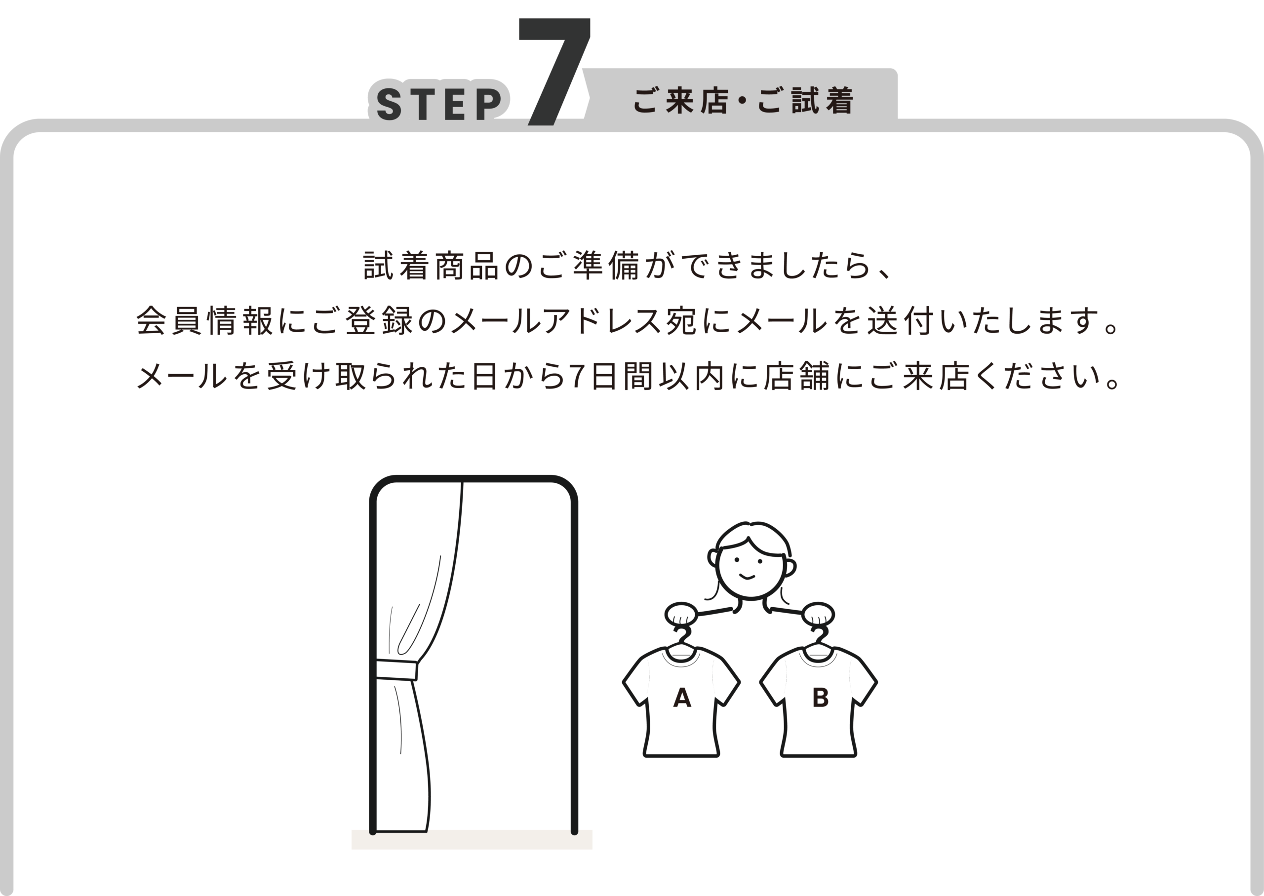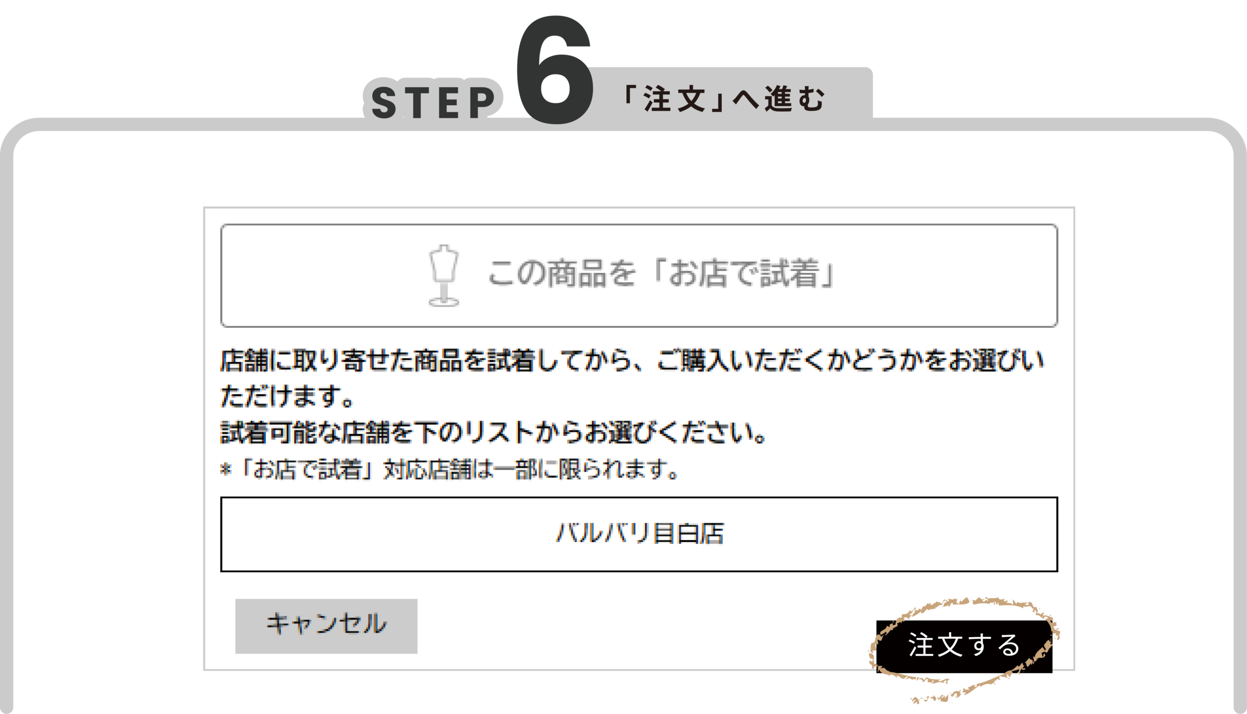 ※ ご注文完了後、ご登録のメールアドレスに 【valuvari】お店で試着受付完了のお知らせメールが届きますのでご確認ください。