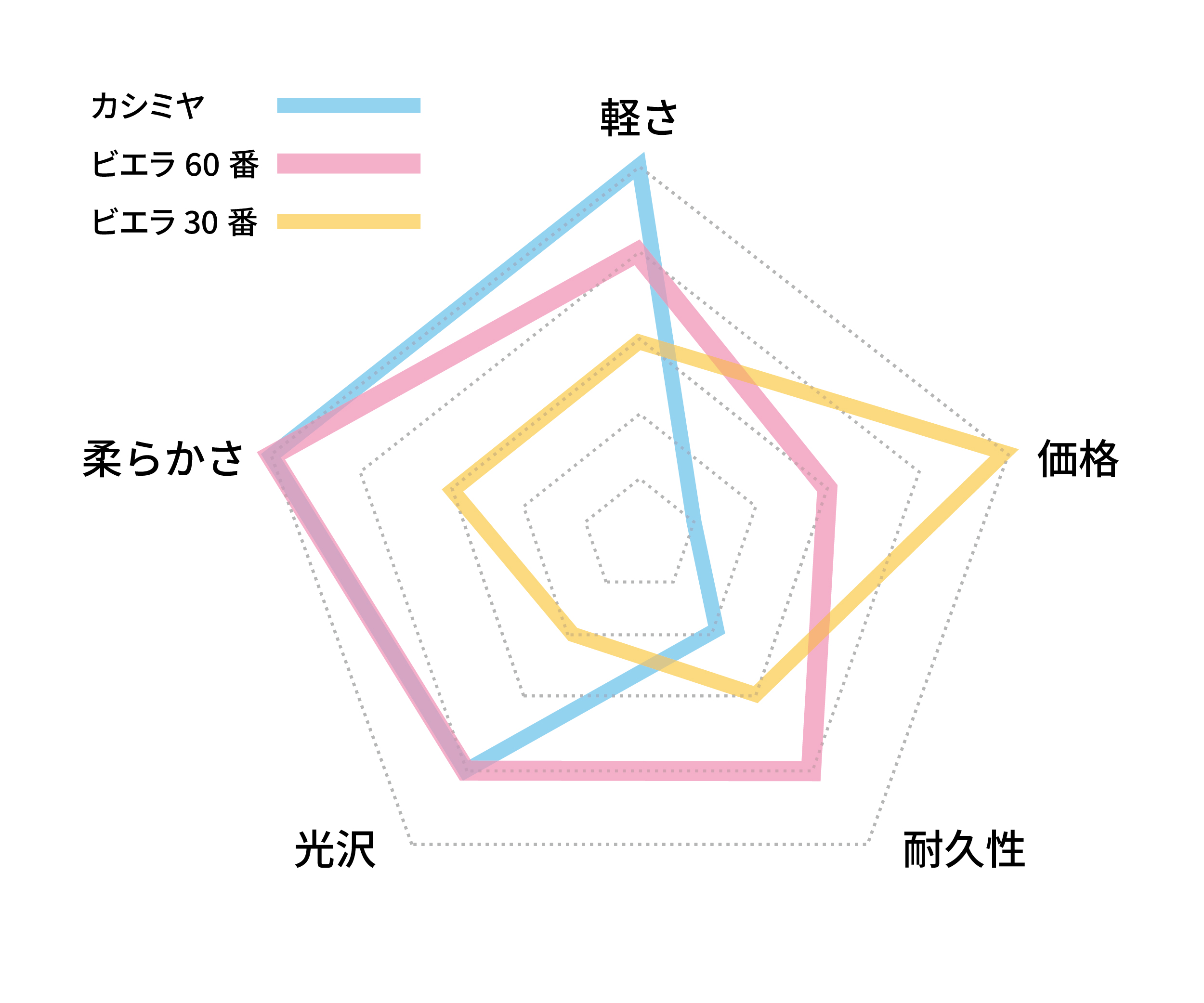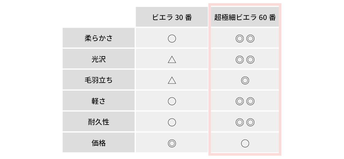 超極細ビエラ60番は、質感・見栄え・機能性のすべてが上位に位置します。