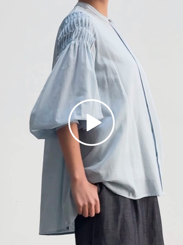 袖ギャザーブラウスは、空気をまとうという言葉がよく似合う一枚です。ガーゼコットン100%のちりめん素材を使用し、細かなシボ感が生地に自然な凹凸を生み、肌との間に空気の層をつくります。だから肌に貼りつかず、汗ばむ季節でもさらりとした着心地が続きます。