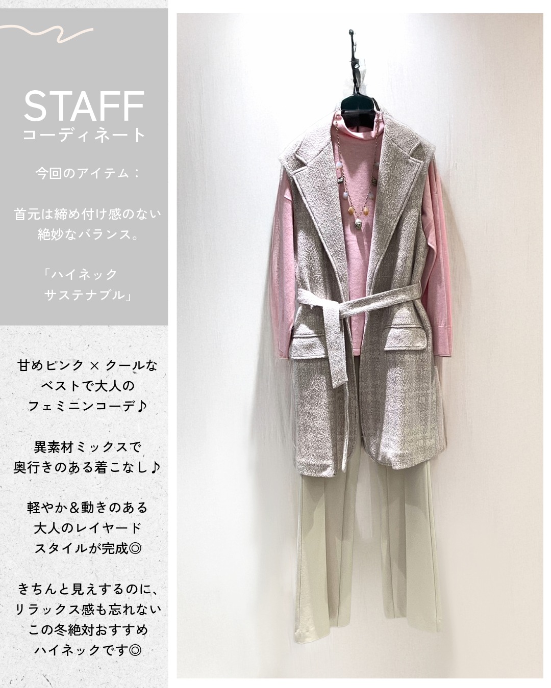 このハイネックニットは、約80色以上の高級残糸から作られたサステナブルシリーズです。